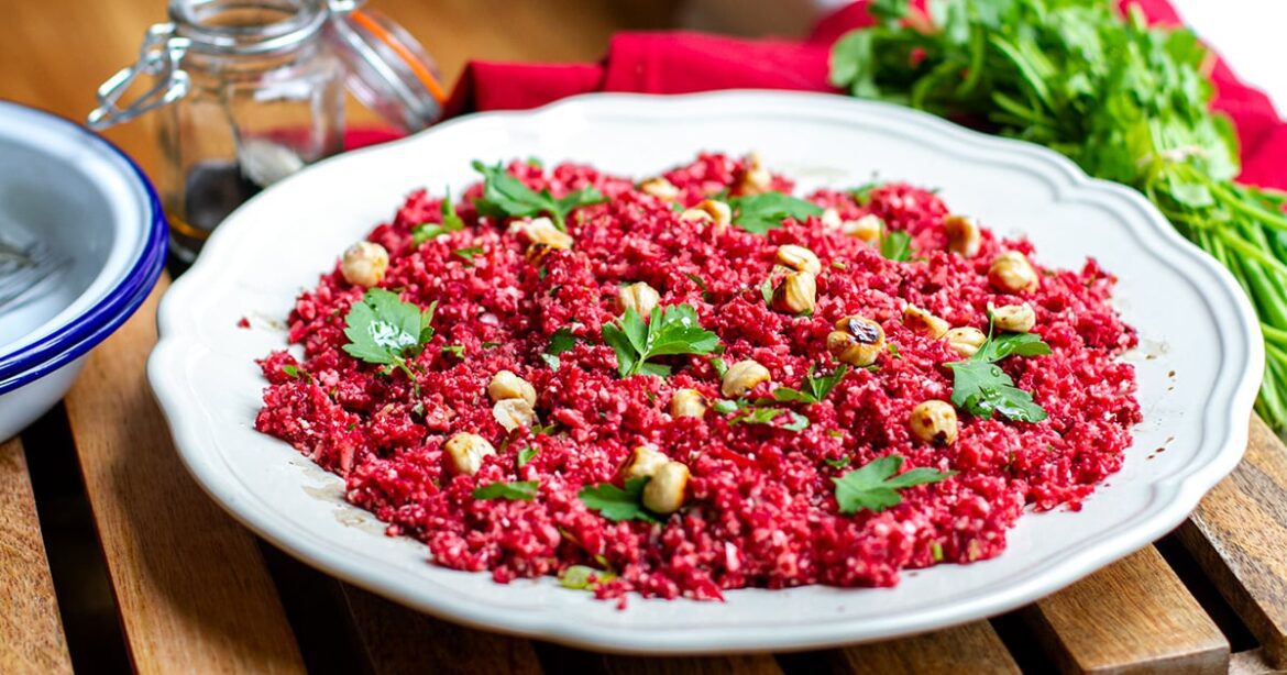 For a vegetarian version, serve this beet ‘couscous’ with grilled halloumi on top or veggie bean or lentil burgers or plant-based sausages.