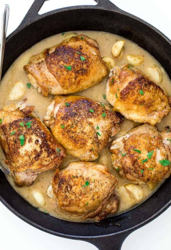 Chicken with 40 Cloves of Garlic. Juicy and tender chicken thighs pan fried and served with tons of garlic and an amazing sauce!Â