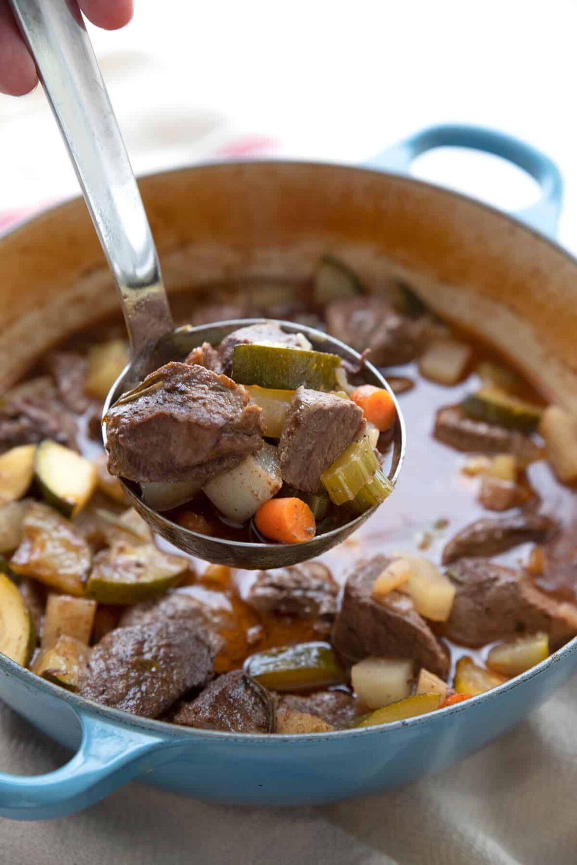- Hold the broth to a minimal. Many keto stews endure from being too soupy. Add solely sufficient broth to permit the meat to prepare dinner slowly. 1 to 1 ½ cups is normally sufficient.
