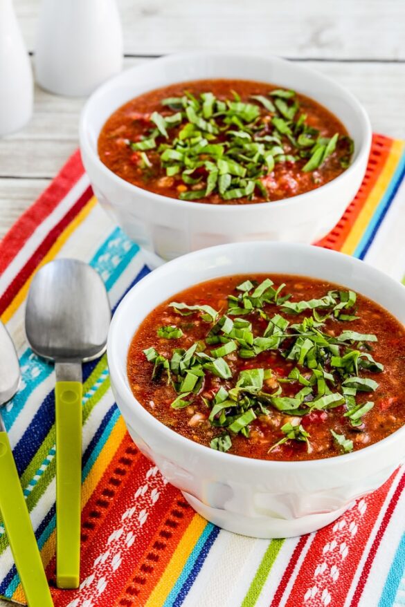 This chilled tomato soup often has bread for thickening, which I didn’t miss in my lower-carb and gluten-free version version.