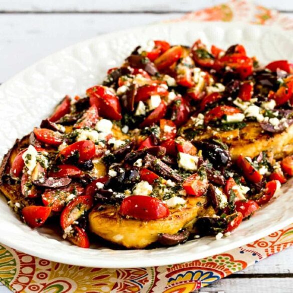 This Greek Chicken with Tomato, Olive, and Feta Topping is perfect for low-carb, Keto, and low-glycemic eating plans, including all phases of the original South Beach Diet. Note that nutritional information doesn’t include the marinade that is not eaten.