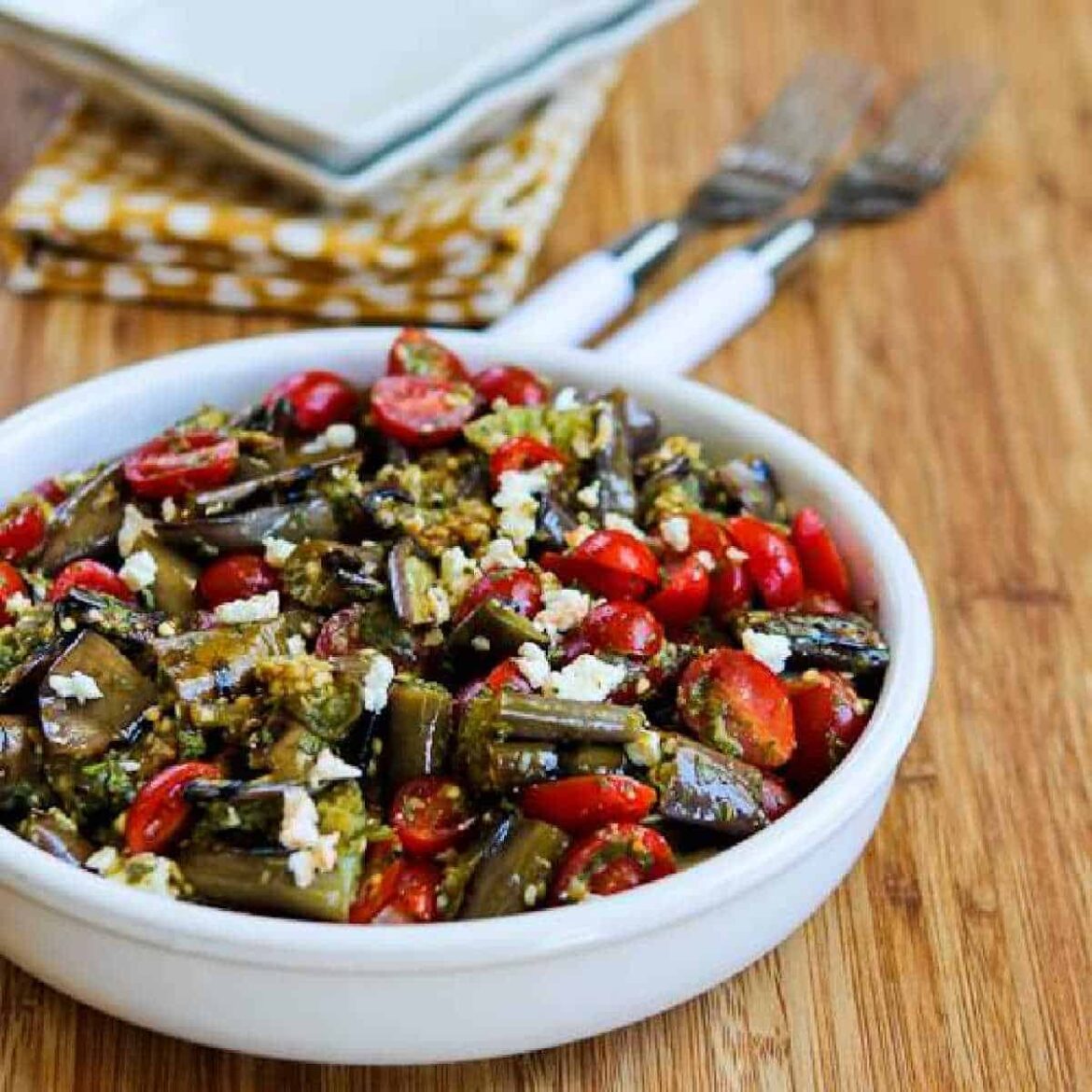 I like this Grilled Eggplant Salad with contemporary cherry tomatoes and Feta cheese and a dressing with basil, parsley, and capers!