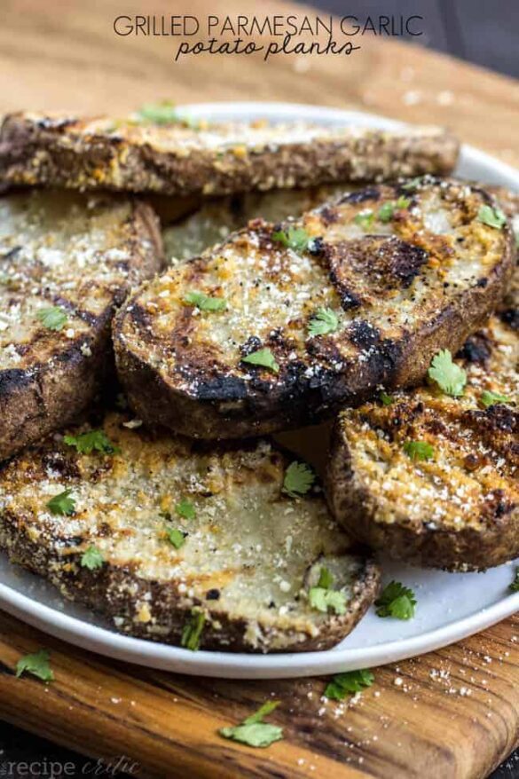 Grilled parmesan garlic potato planks stacked on top of each other on a white plate.