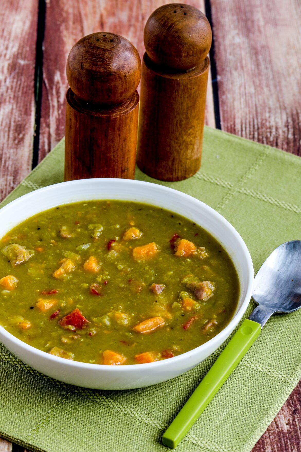 My Instant Pot Split Pea Soup has ham, sweet potatoes, and red bell pepper, and this tasty soup can be ready in about 45 minutes! This soup is surprisingly low in net carbs, but see suggestions if you want an even lower-carb version of split pea soup.