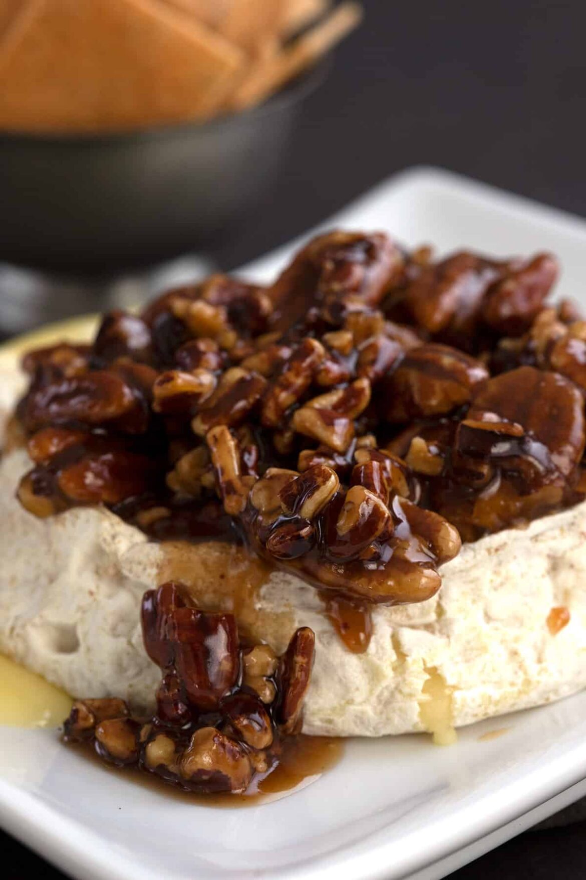 - Top with the pecan sauce. Add the sauce over the top of the cheese, piling it up toward the center.