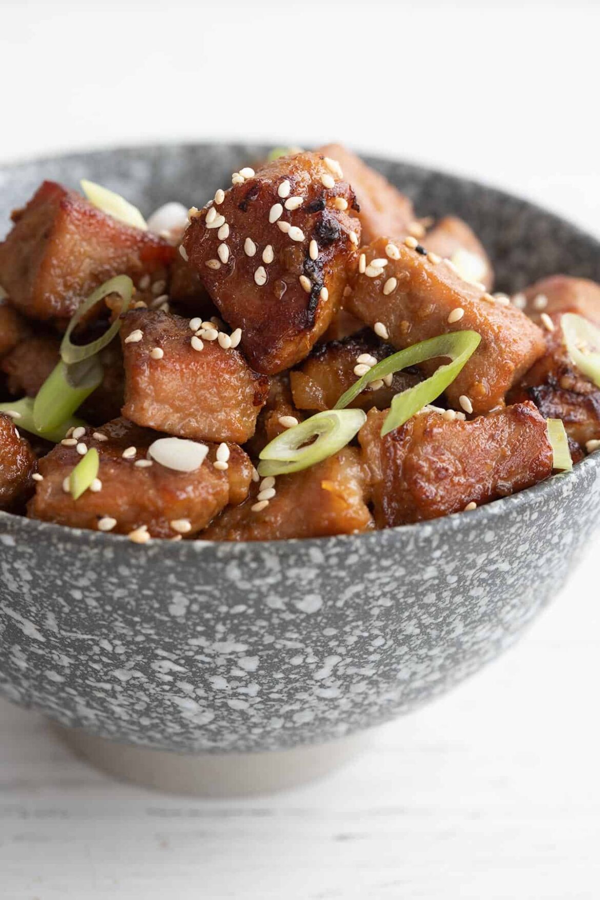 Pork bites piled up in a gray bow, sprinkled with sesame seeds and chopped green onion.