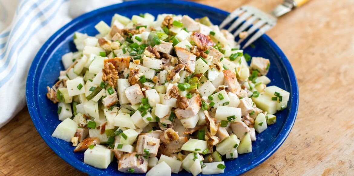 Cook’s notes: Either green or purple kohlrabi can be used in this salad. If you can’t find kohlrabi or it’s not in season, you can replace it with raw carrot, fennel, radish or cucumber (or a combination of such). If you don’t have the time to grill the chicken, simply add some diced up turkey, ham or even tinned tuna for protein. Crispy bacon or grated Parmesan cheese would go nicely as additional ingredients.