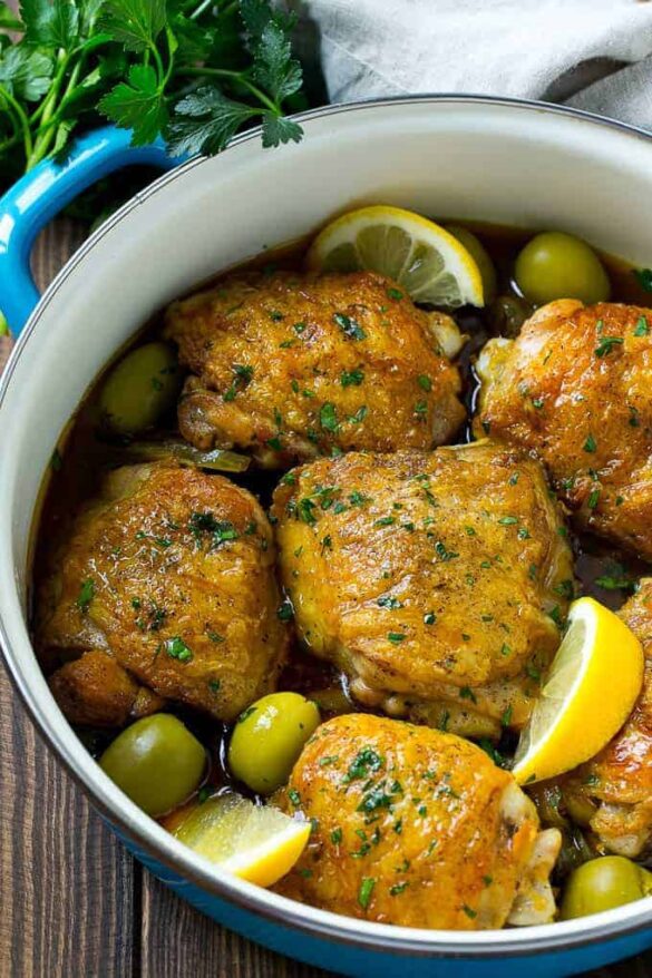 To make Moroccan chicken, you’ll need chicken thighs, onion, green olives, lemon and spices. The chicken thighs are seared to golden brown perfection, then combined with sauteed onions and spices and roasted until done. Be sure to use an oven safe pan so that you can transfer it from the stove to the oven without any issues.