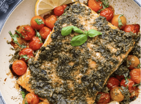 Pesto Salmon is the BEST salmon you will ever make! Smothered in fresh basil pesto and soaked in roasted tomatoes, this salmon is then baked to perfection for a juicy and tender salmon fillet.