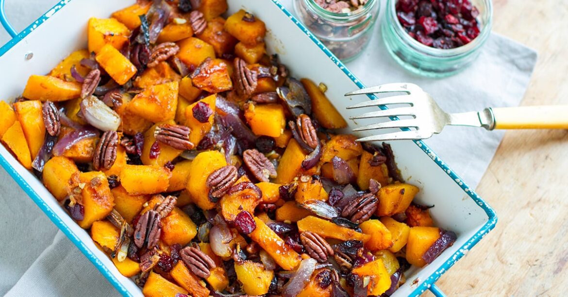 When it comes to festive pumpkin side dishes, this roasted Kabocha squash with cranberries and pecans brings all the autumnal feels to the table. This one-pan baked dish can also be made with butternut squash and is super easy to prepare. Serve alongside a variety of mains. It’s great for Thanksgiving, Christmas and your regular roast dinner. This squash recipe is gluten-free, paleo, dairy-free, vegan-friendly.