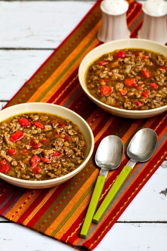 This delicious lentil soup was first posted in 2007 and I’ve enjoyed it so many times since then.  Photos were updated January 2015, and the recipe was last updated with more information and a lower-carb version in 2022.