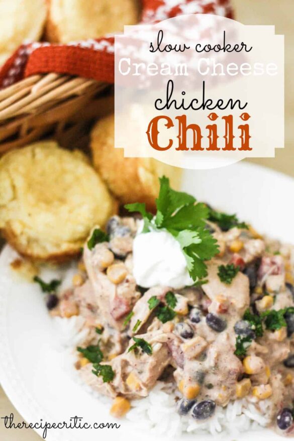Slow Cooker Cream Cheese Chicken Chili is a little bit spicy, a little bit savory and a whole lot of perfect! Chicken perfectly cooked, topped with veggies and spices and then smothered in smooth cream cheese will definitely warm you up!