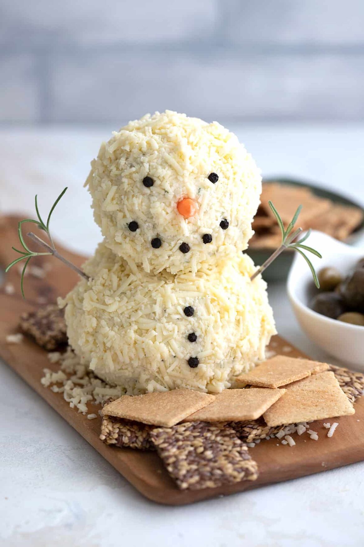 The unassembled cheeseballs can be stored, wrapped in plastic, for several days. Once you’ve put together the snowman, it will dry out if left out longer than a day.