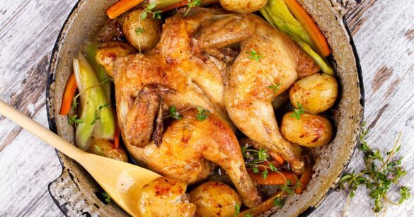 I love a good Sunday roast and today I want to share a recipe for roasted spatchcock chicken perfectly cooked with a buttery sauce of herbs, garlic and lemon and roasted potatoes, leeks and carrots. It’s a hearty, nutritious dinner (or lunch) the whole family will love and it only takes about 1 hour or so.