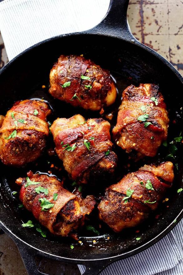 Tender and Juicy Chicken that is wrapped in bacon and coated in a blend of spices. It bakes in brown sugar which caramelizes when it cooks. You are going to love the sweet and spicy flavor!