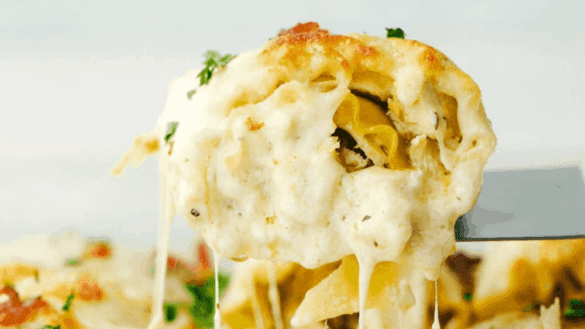 6. Bottom of Pan: Line the bottom of the 9×13 pan with 1 cup of the alfredo sauce.