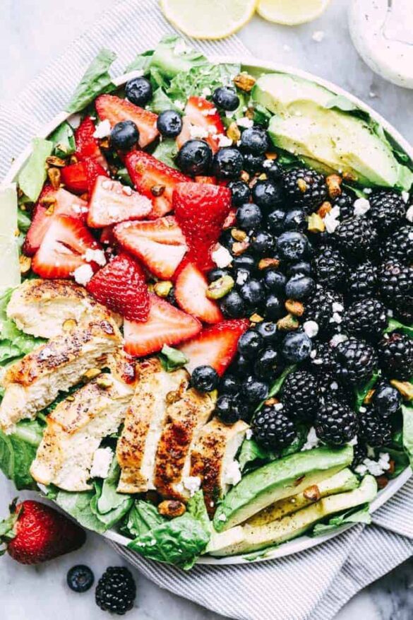 Triple Berry Chicken Avocado Salad with a Creamy Lemon Poppyseed Dressing is my all time favorite salad! Tender and juicy pan seared chicken with romaine lettuce, avocados, strawberries, blackberries, and blueberries. Topped with pistachio nuts, feta cheese and drizzled in the best creamy dressing!