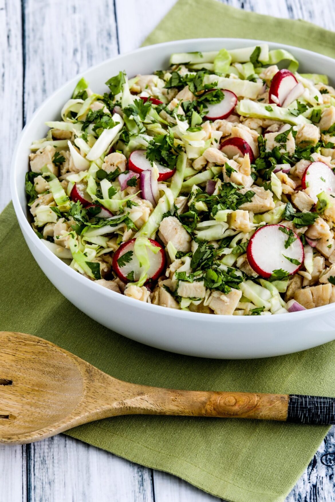- When able to serve, add the cabbage, radishes, and cilantro to the hen/dressing combination and toss, including extra dressing till the salad is as moist as you’d prefer it. (It’s possible you’ll not want to make use of all of the dressing.)